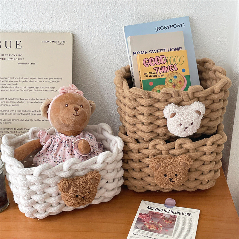 韩国ins风小熊棉麻编织篮桌面收纳篮可爱化妆品杂物...