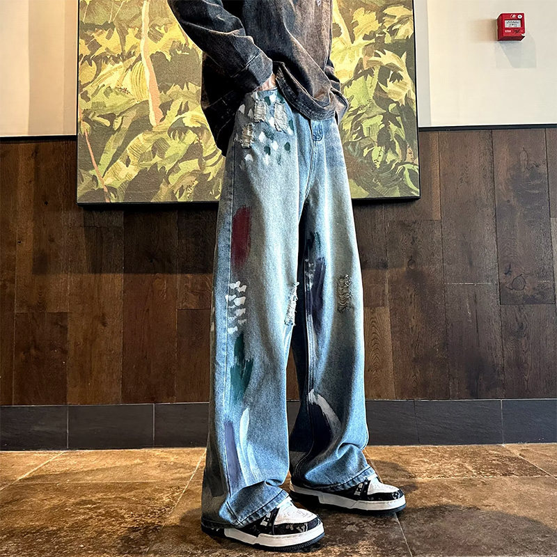 牛仔裤男春季美式高街痞帅水洗做旧阔腿裤子潮牌宽...