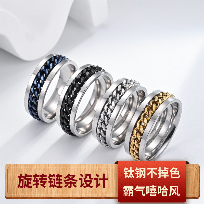 新简约转运饰品男士钛钢可转动开啤酒瓶链条戒指个...