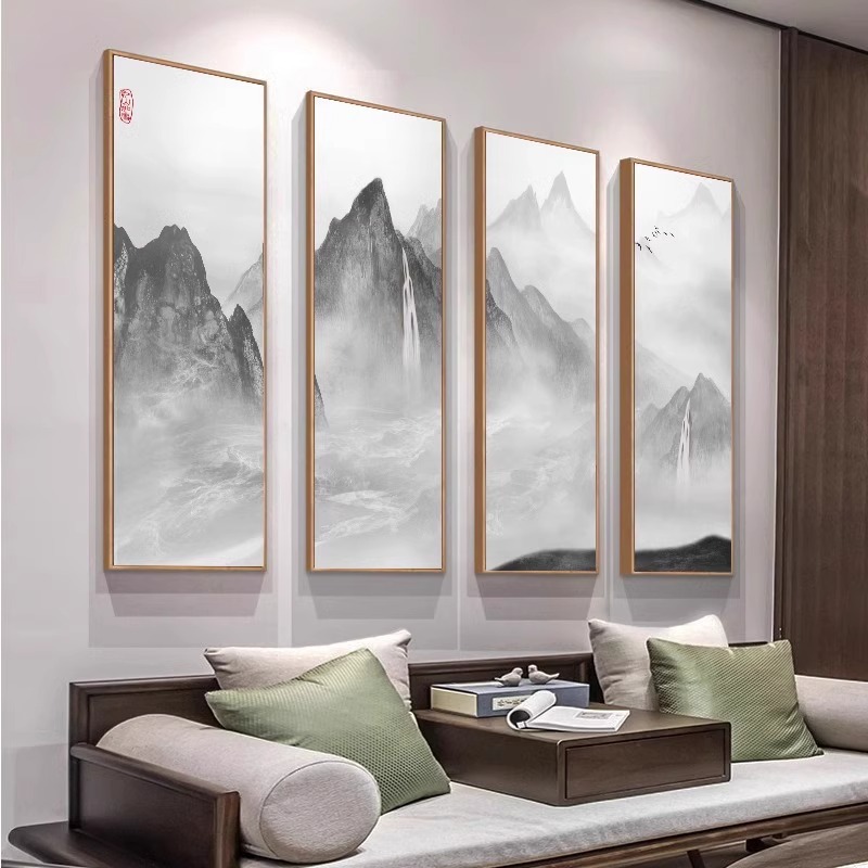 新中式客厅装饰画茶室水墨禅意山水书房四联挂画办...