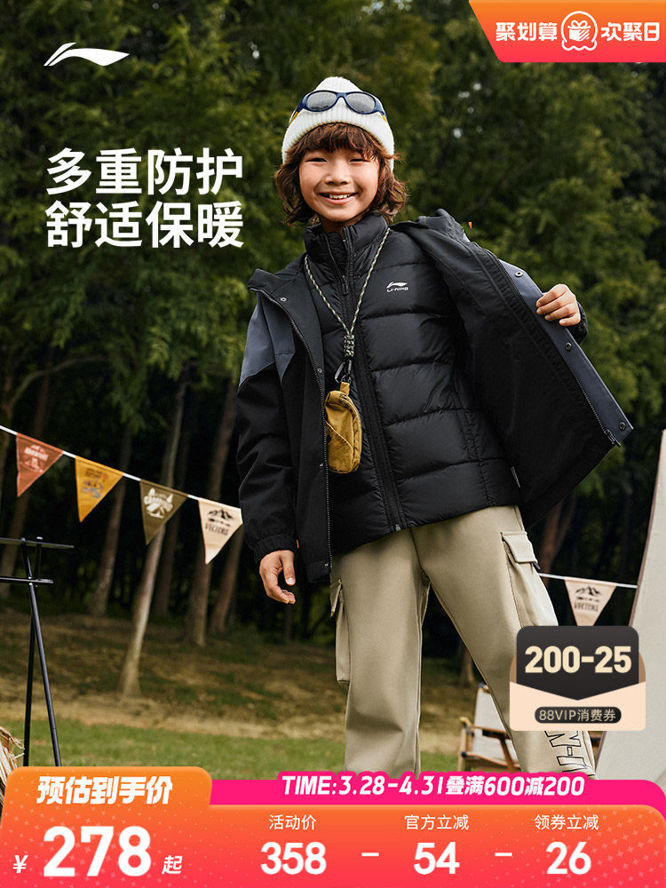 李宁儿童三合一外套羽绒服冲锋防风衣男童装男孩大...