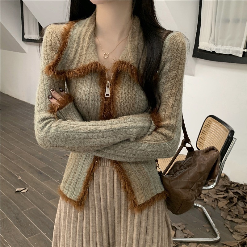翻领短款针织开衫女外套秋冬新款设计感洋气外穿内...