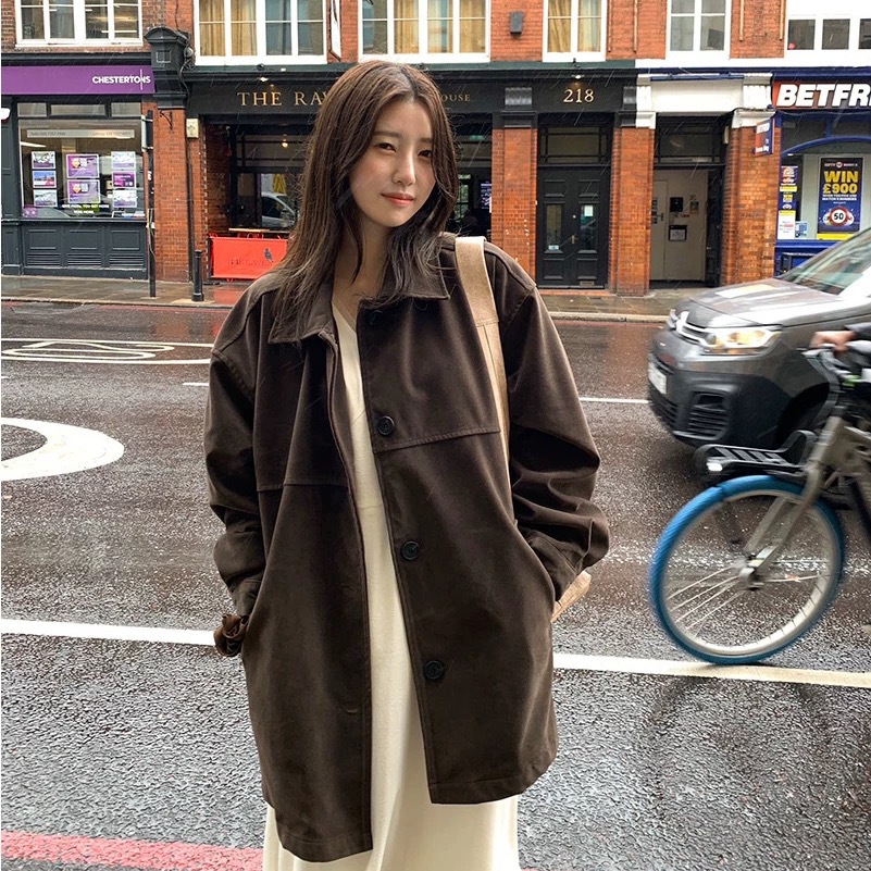 韩国chic秋冬韩版复古美拉德穿搭宽松麂皮绒风衣中...