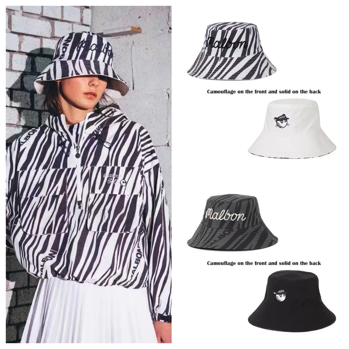 韩版高尔夫球帽男女同款双面可戴时尚斑纹渔夫帽防...