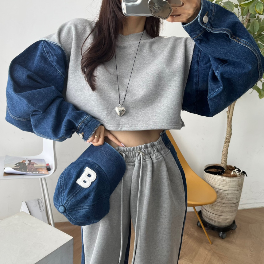 韩国东大门新品时尚拼色短款长袖卫衣上衣松紧腰束...