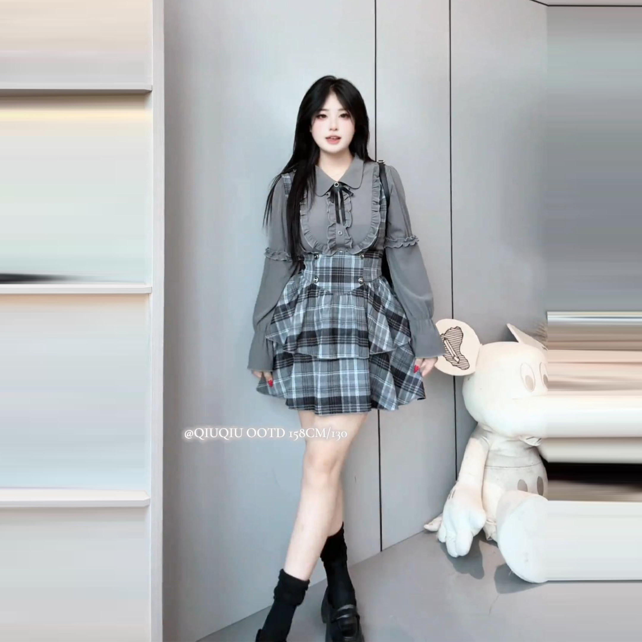 大码复古木耳边娃娃领衬衫女春秋胖mm显瘦收腰格纹...
