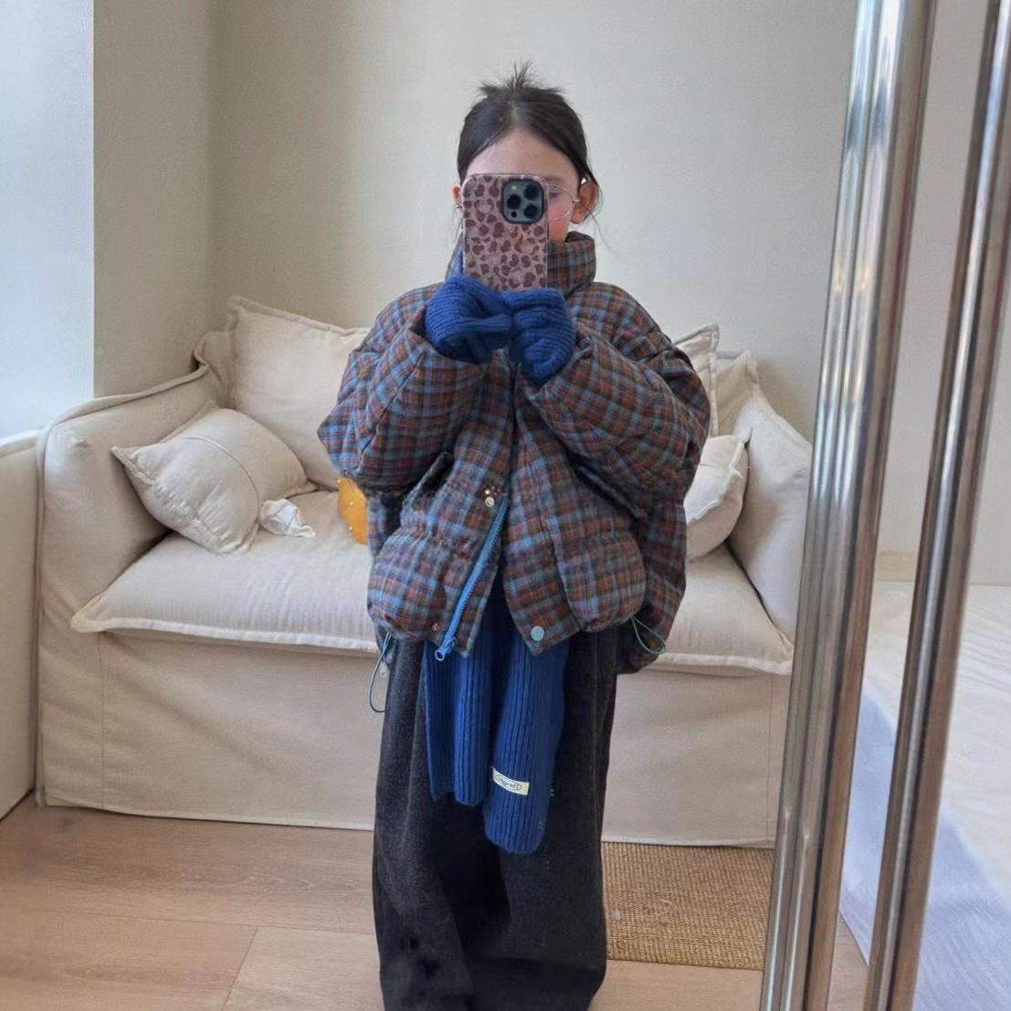 女童复古格子棉服2025冬新款儿童立领夹棉外套女孩...