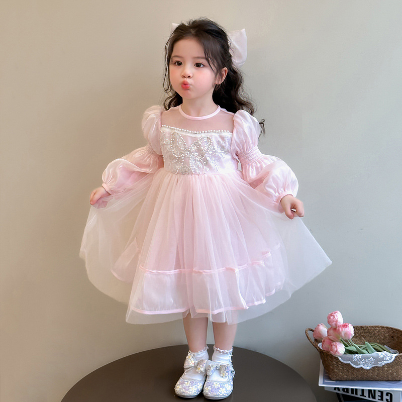 女儿童长袖网纱连衣裙2025小女孩珍珠蝴蝶蓬蓬公主...