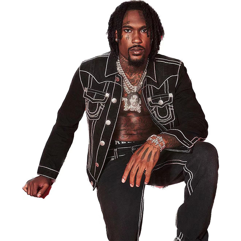 美式潮牌宗教信仰牛仔夹克男士大佛大码白粗线弥勒...