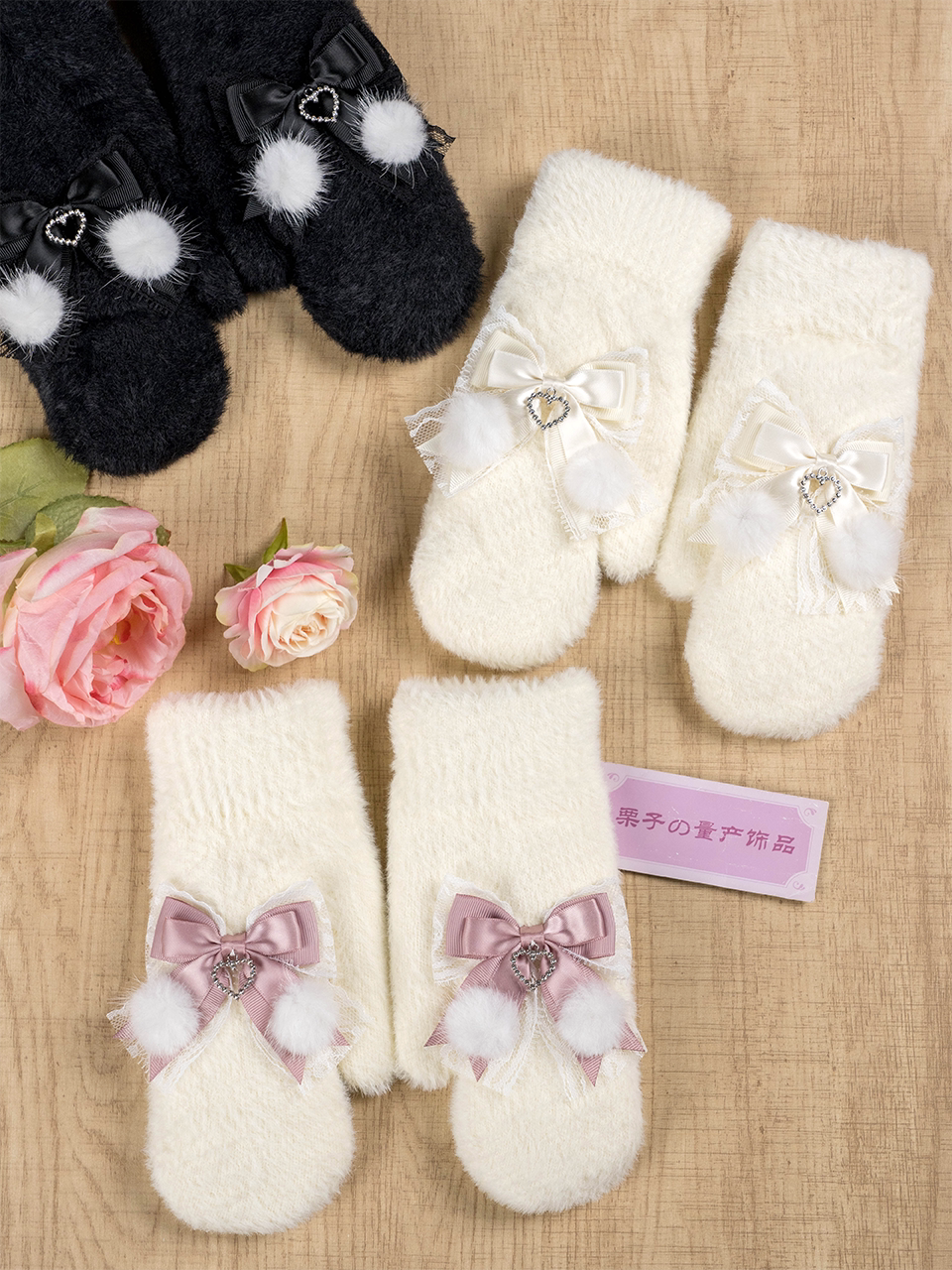 日系仿貂毛加绒加厚蝴蝶结手套秋冬可爱女学生保暖...