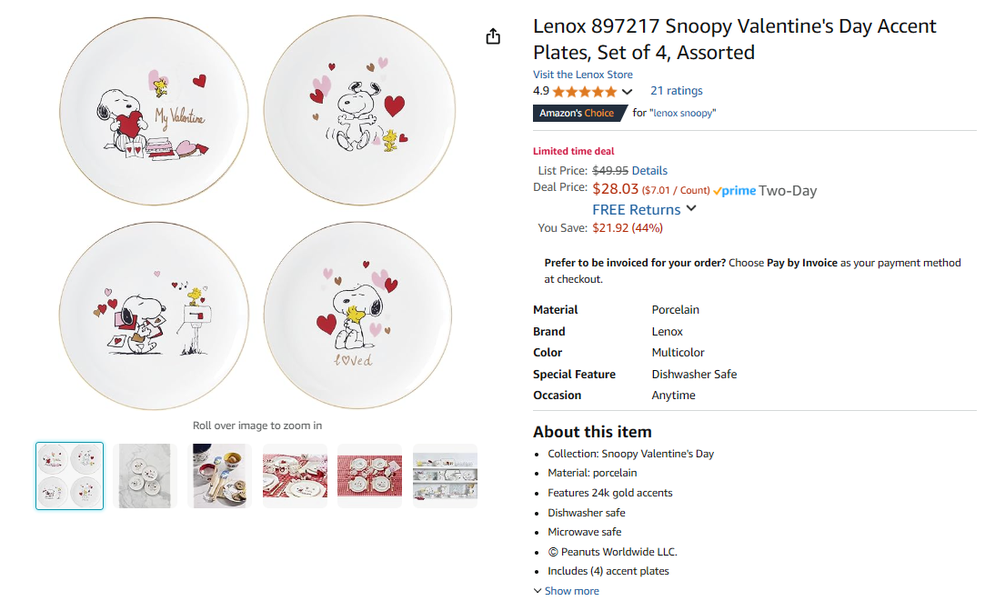 레녹스 스누피 발렌타인 접시 4피스 세트 ($49.95 $28.03)   Save $21.92