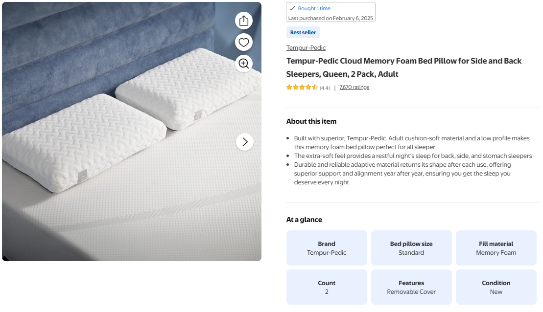 Walmart / Tempur-Pedic Cloud Memory Foam Bed Pillow for Side and Back Sleepers,